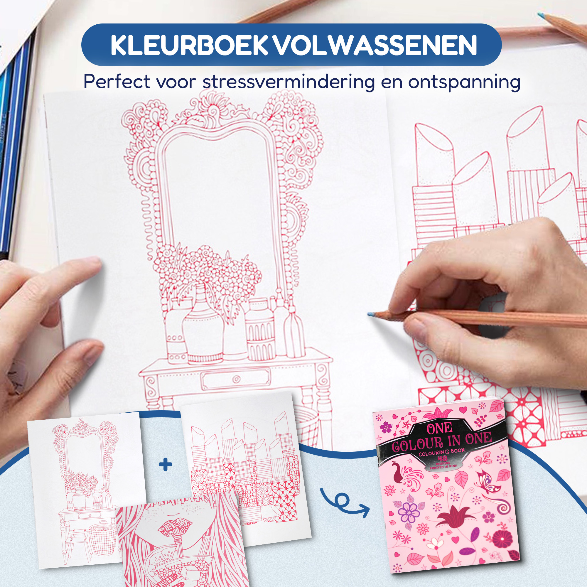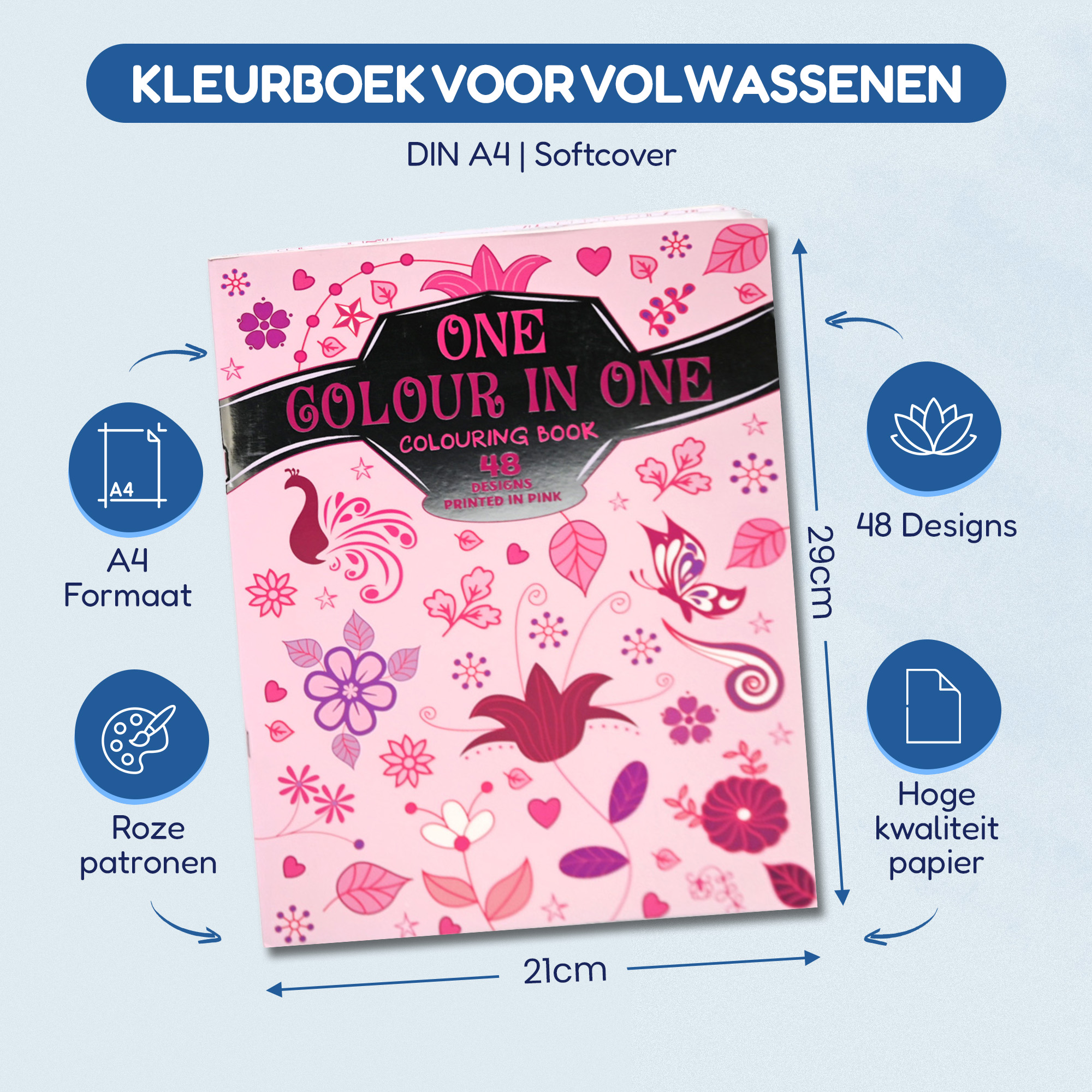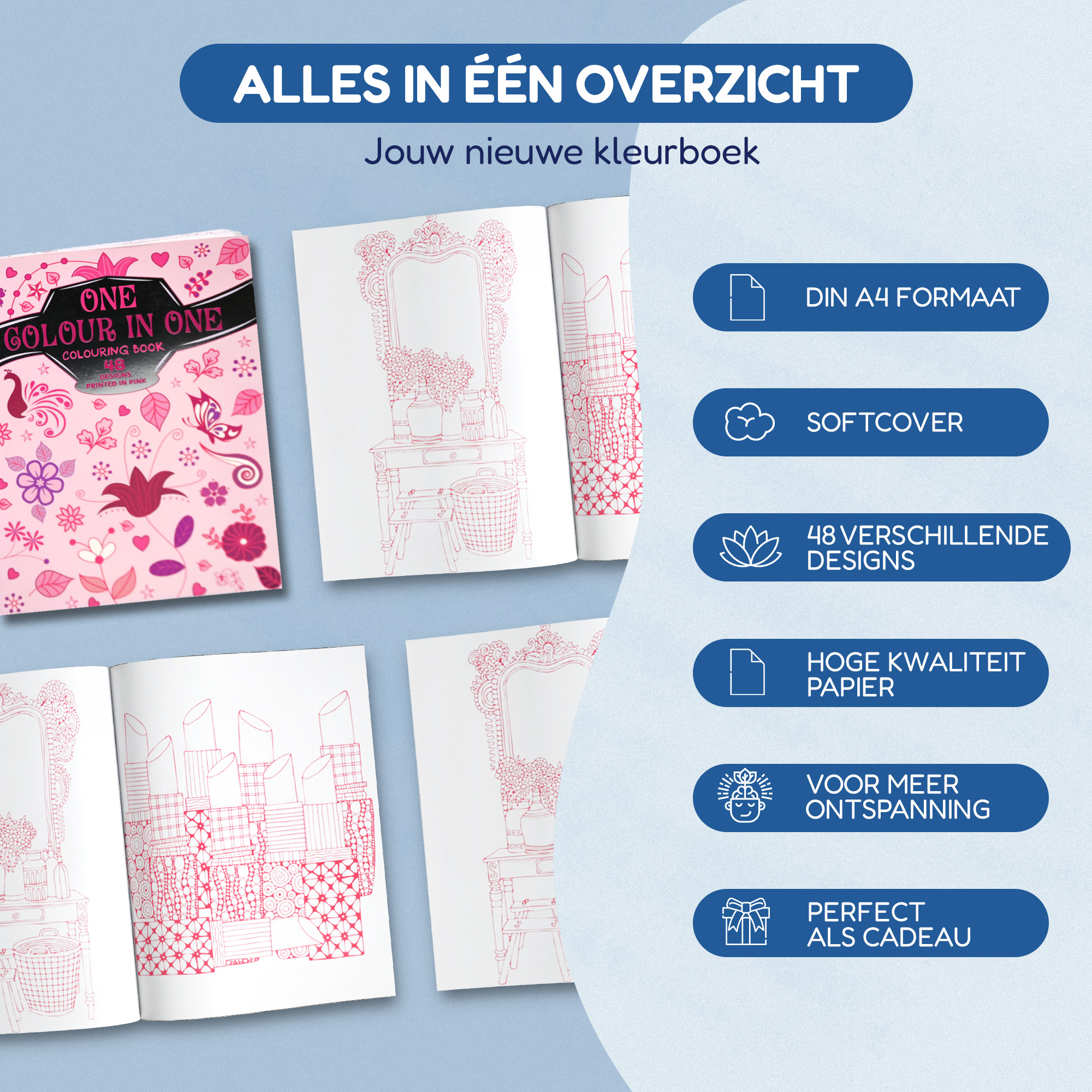 Laat de charme van roze je verbeelding inspireren en maak van elke pagina een kunstwerk vol sereniteit en elegantie. Bestel nu het ‘Eén Kleur in Eén Kleurboek Roze’ en ontdek de rust en vreugde van kleuren in één kleur!