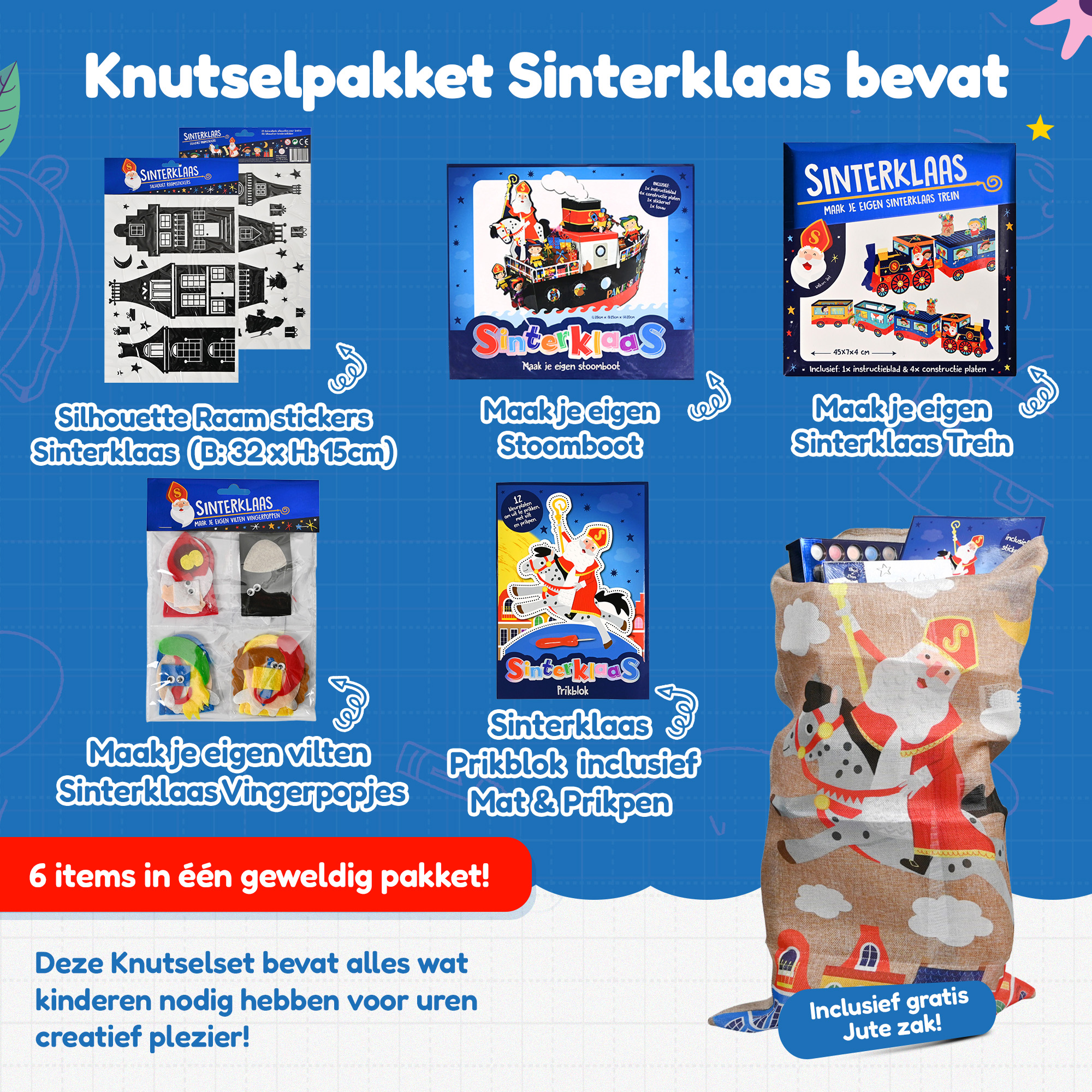 Gratis Jute Zak – Bewaar je knutselmaterialen in deze sfeervolle jute zak, of gebruik hem om de cadeautjes in te verstoppen. Een leuk extraatje dat helemaal past bij de Sinterklaastraditie!